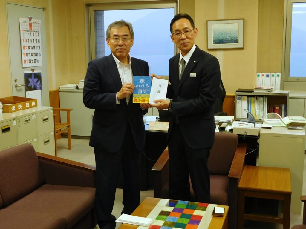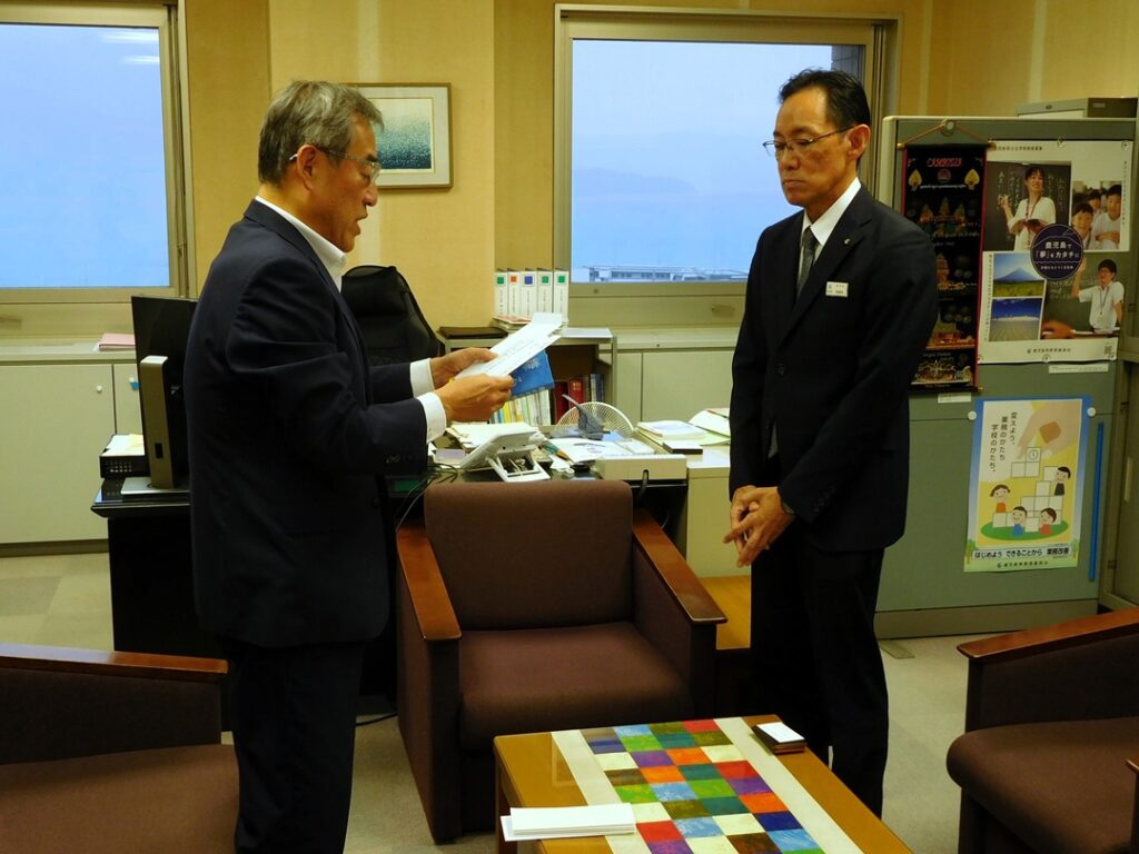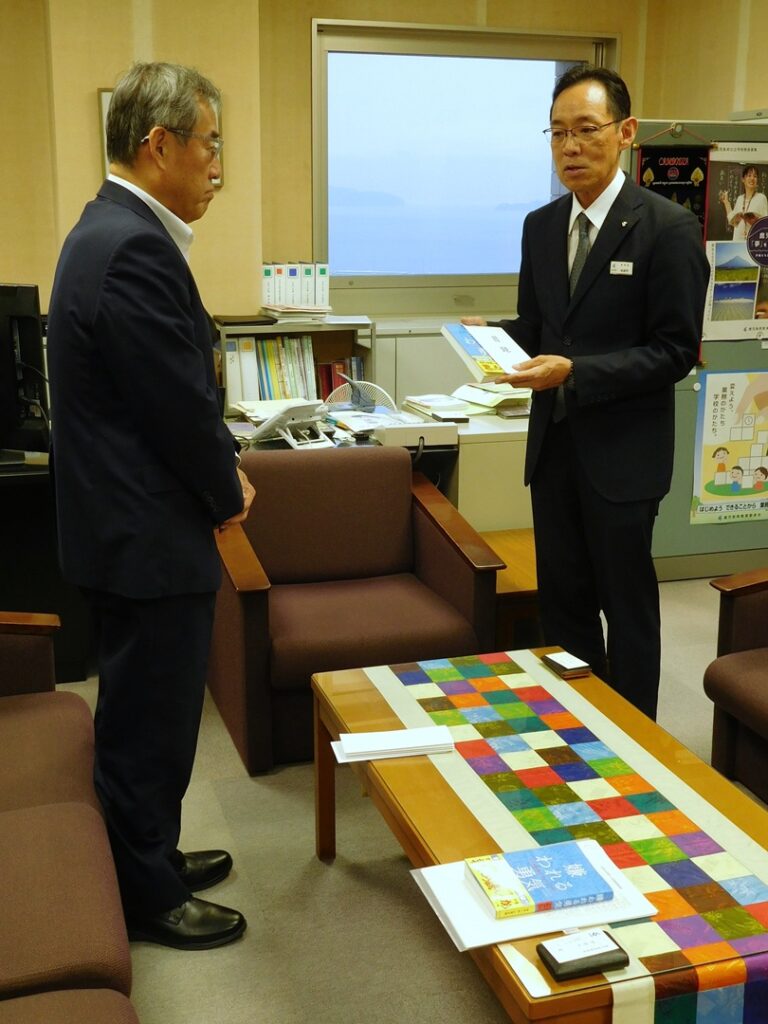 応対された地頭所恵 県教育長からは「長年にわたり多くの図書を寄贈していただき感謝している。それぞれの高校生がこの本に触れることにより、主体的に自分の人生を考えるきっかけになることを期待している。昨今、若者の読書離れを色々言われている状況であるが、各校の図書室の司書と協力しながら工夫していきたい。」との謝辞がありました。